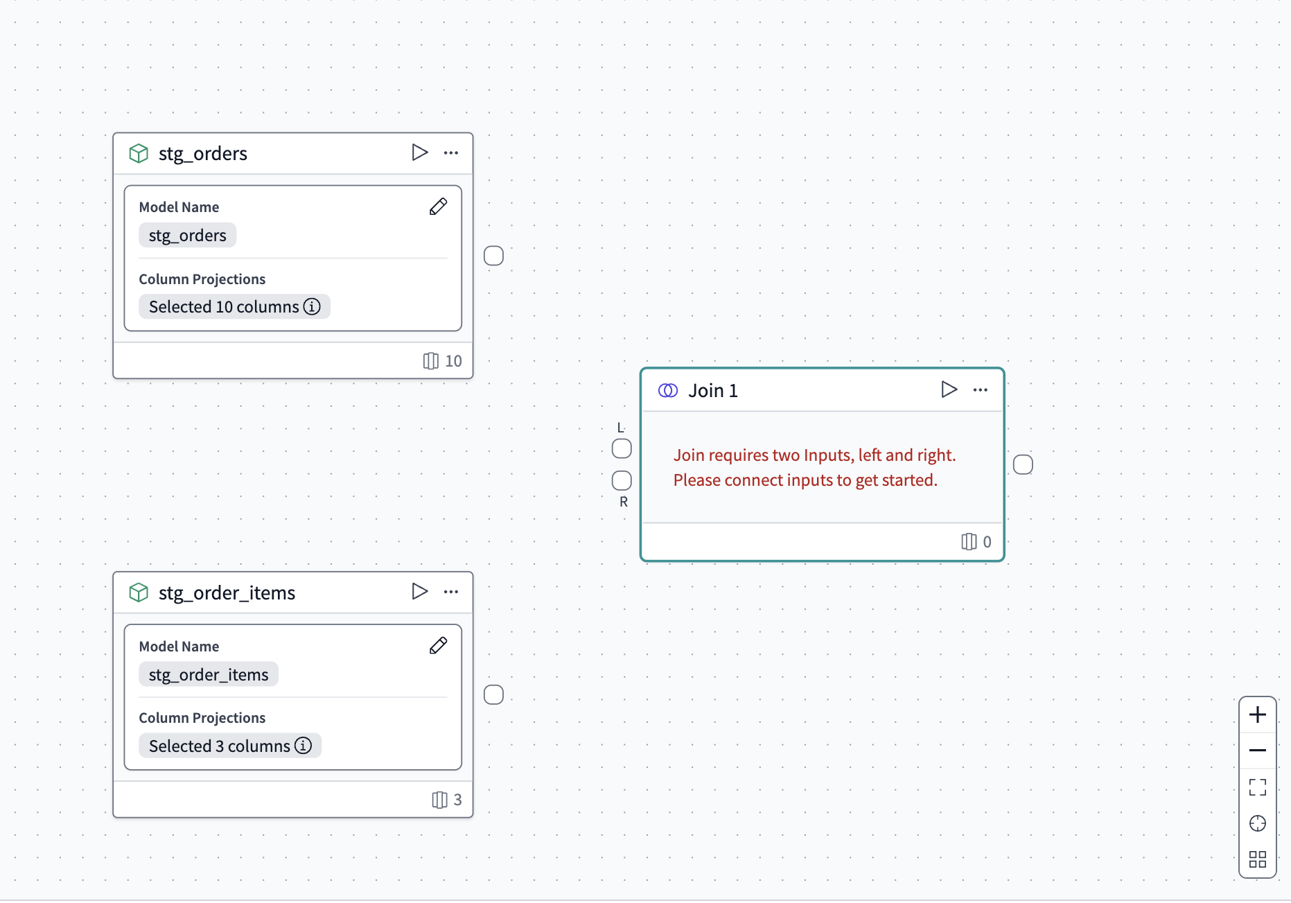 2. Click and drag a line from the + connector below the L on the join border to the + on the stg_orders model. Do the same for the R connector to the stg_order_items model.